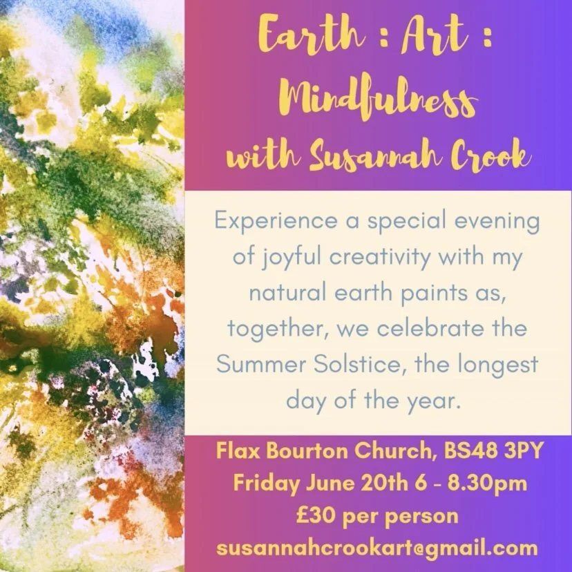 20th Earth: Art: Mindfulness workshop at Flax Bourton Church celebrating the Summer Solstice. The natural colours we will use will relate to summer and will include some seasonal botanical colours as well as my earthier tones. You will also have access to some Egyptian Blue and some genuine Gold Mica. This will be an evening of exploration with some gentle guidance. The sun and early summer flowers will be our inspiration.